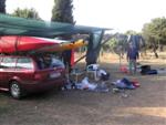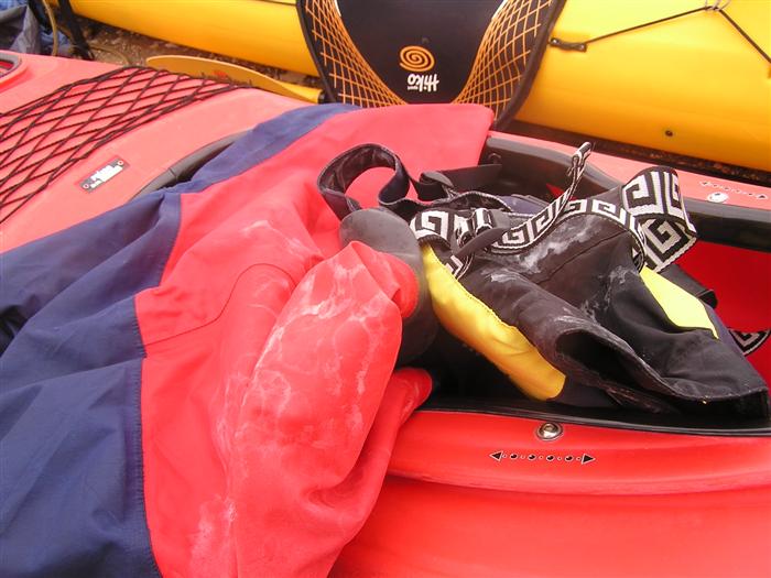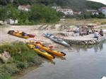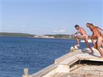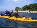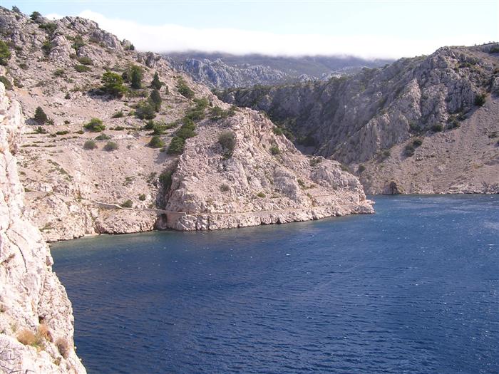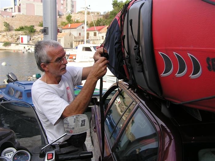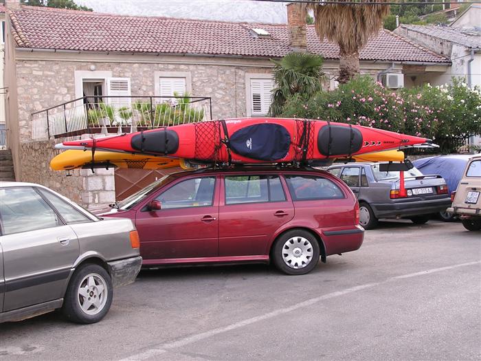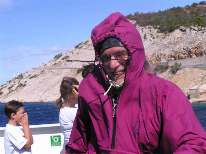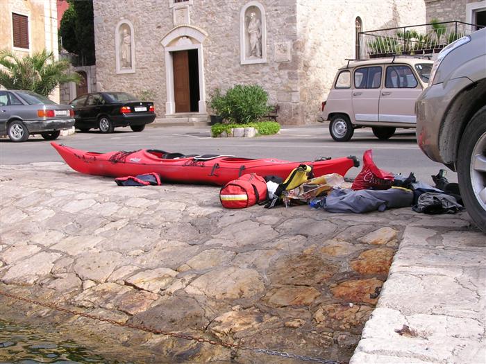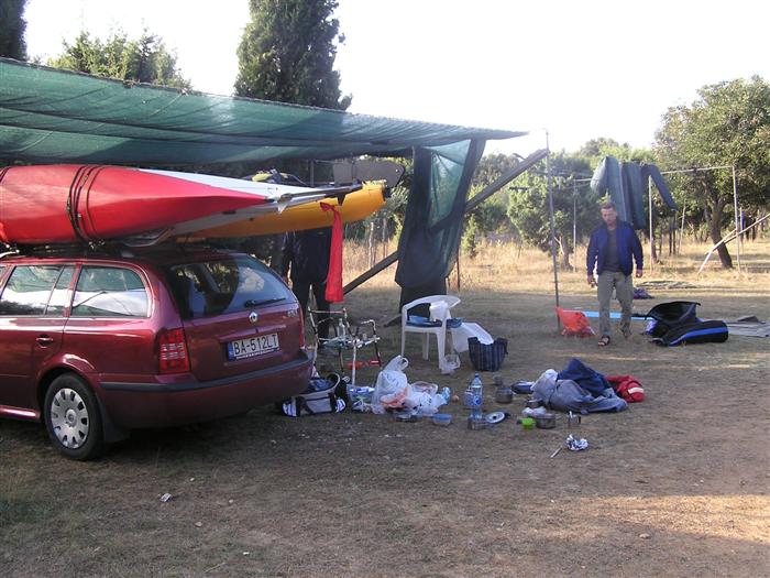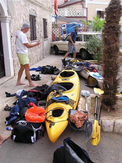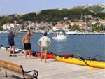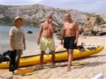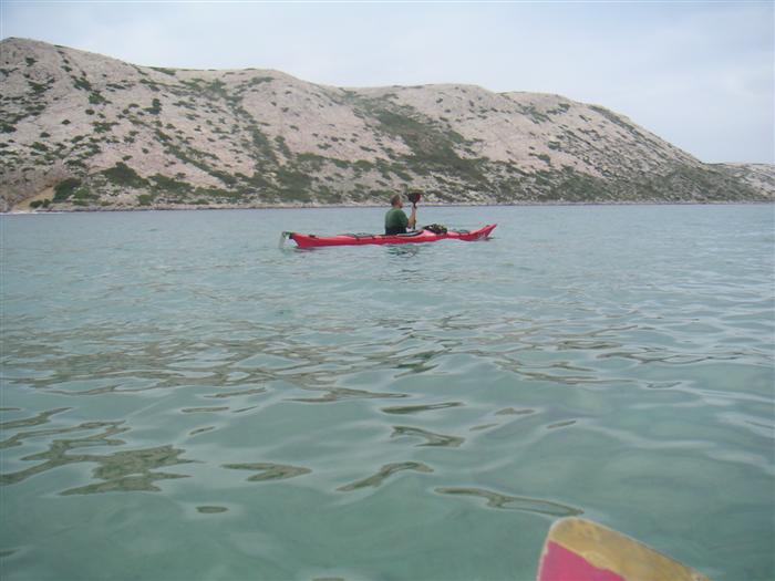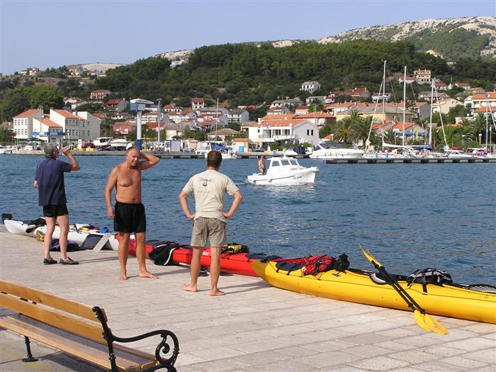prichádzame s Octáviou a 3 seakajakmi na streche do Jablanacu: Milan (Seayak požičaný od Slávky), Sigi a Martin (double kajak požičaný z Paddlershopu) a ja (Kodiak z KKKV) Vieme, že predpoveď počasia je nevalná a hlavnou prekážkou bude vietor. Cieľ oboplávať ostrov Rab, ktorý som plánoval ešte v júni. Aj keď to nepôjde, získame aspoň prvé morské skúsenosti. Priamo v malom prístave v stiesnenej zátoke s trajektom na Rab horko-ťažko parkujeme a nakladáme kajaky rovno na chodníku pred poštou. Trvá to nekonečne dlho a kajaky sú neskutočne ťažké, zdá sa, že eskimovať s takým krížnikom nebude vôbec možné. Naše kajaky už na brehu budia záujem: akýsi Chorvát ich chce kúpiť, iný zas varuje, že zajtra príde bura (bóra), ktorá nás 100% prevráti. O 11:20 konečne vyrážame: Sigi s Martinom sa ani nepotrebujú rozpádlovať na neodskúšanom kajaku a v dvojici (ani veľmi nie je kde) a tak naberáme kurz priamo na Rab cez Velebitský kanál, ktorý je v tejto úžine 2-3 km široký. Kanál je nechvalne známy nebezpečnou bórou (padavý vietor od pevniny, ktorý klesaním z pohoria Velebit môže získať neskutočnú rýchlosť a spustiť sa veľmi nečakane aj počas tlakovej výše). Z auta vyzeralo more úplne pokojné, medzitým sa trochu zdvihol vietor a funguje aj „autobusový efekt“: krátke a nepravidelné vlny a vietor prichádzajú zľava a celkom slušne nás pohupujú – morskú nemoc na kajaku sme ešte nikto nemali… Sledujeme viac-menej trasu trajektov, akurát sa im snažíme nezavadzať a asi po 20 minútách sme už pri brehoch Rabu, ktorý z tejto strany vyzerá ako mesačná krajina – holé skaly, útesy, planiny, s najvyšším bodom až 410 m - dôsledok krutých vetrov od pevniny. Ďalej pokračujeme okolo ostrova v smere hodinových ručičiek. Minimálne ďalšie 4 km je breh skalnatý bez pláže a možnosti pristáť. Zatáčame do Barbatského kanála medzi Rabom a pozdĺžnym neobývaným ostrovom Dolin. Vietor i prúd máme teraz výhodne od chrbta, vraj tu vznikajú prúdy s rýchlosťou až 6 uzlov. Konečne nachádzame menšiu pustú pláž, pristávame a vychutnávame morský kúpeľ. Milan skúša eskimovať a napodiv to ide. Charakter brehu sa mení: pribúda zelene a postupne i civilizácie, našťastie už po hlavnej sezóne, takže to celkom ujde. Ďalšie pristátie je v mestečku Barbat a pivo je 20 metrov od kajakov! Jedlá tu nepodávajú a tak nie je problém zjesť pri pive vlastné. Breh je už pomerne husto osídlený a ďalšie pádlovanie nás privedie do chráneného prístavu v mestečku Rab. Kajaky musíme zdvihnúť na prístavné mólo, nechávame ich na mestskej promenáde a ideme sa pozrieť do mesta: neskutočne krásne staré kamenné uličky a niekoľko románskych kostolíkov s vysokými vežami – na jednu aj vychádzame. Už sa pomaly zvečerieva a mali by sme pohľadať vhodné miesto na noc. Vietor i vlny sa dvíhajú a nám sa veľmi nechce. Ďalší ľudia nás varujú pred zajtrajším zhoršením počasia a bórou. Milan zastáva názor, že veľa informácií škodí. Kajaky skladáme z móla na rozvlnenú hladinu a nasadanie je trochu problematické. Konečne pádlujeme von z prístavu v ústrety pomerne silnému vetru a vlnám spoza prístavného mysu a mám pocit, že ľudia na brehu by teraz za nás veľa nedali... Strihneme záliv Sv. Fumija a zatáčame za ďalší polostrov. Obloha je pochmúrna, vietor a nepravidelné bočné vlny dosť nepríjemné – občas spoza nich vidíme len hlavu ďalšieho kajakára. Hľadáme už miesto na pristátie a po pár kilometroch ho konečne nachádzame: pristávame v slušnom príboji na úzkej plážičke neďaleko Uvala Kandarola. Je tu malý bufet, dávame si pivo a v eufórii hustíme do servírky Janice – asi tak ako to robia Jugoši u nás :-) Dnes to bolo 18 km.