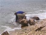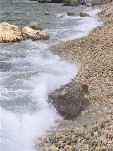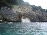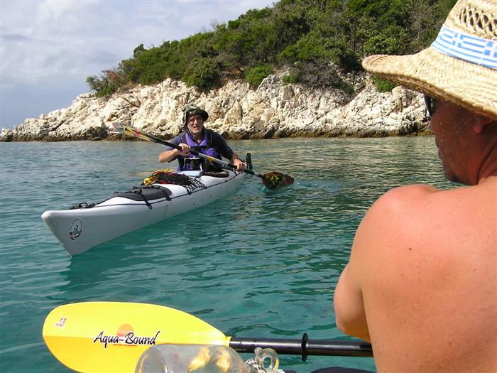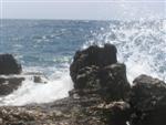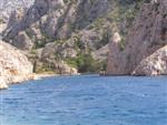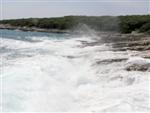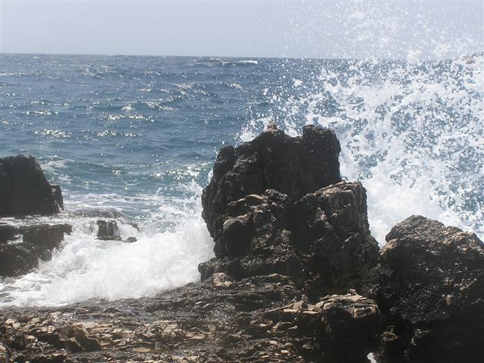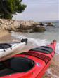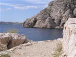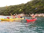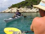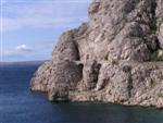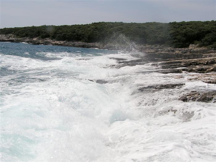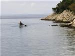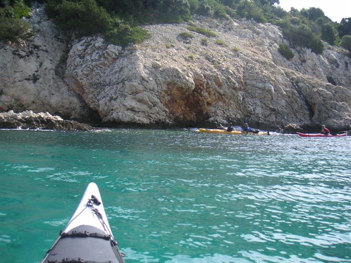 V noci zas prší, ale ráno je prijateľne. Z chodníka, ktorý stúpa strmo do kopca k ceste však vidno za mysom Sorinj biele čapičky lámajúcich sa vĺn. Ranné balenie lode už je celkom rutina a nechávame si po ruke aj suché bundy. Pokračujeme na SZ k mysu Sorinj. Pádlujeme okolo krásnych skalných útesov s podvodnými dutinami, kde vlny pri náraze zvláštne dunia a voda strieka niekoľko metrov do výšky. Pristáť veľmi nie je kde. Ako sa blížime k mysu, tak vietor i vlny silnejú a už trochu vidno, čo nás čaká ďalej. Ide do tuhého: v poslednej chránenej zátoke si obliekame na vode suché bundy a Sigi s Martinom dokonca i vesty (ja som ju nosil celý čas). Dohodneme sa, že sa budeme držať pokope a blízo mysu urobíme rozhodnutie Go/NoGo a vyrážame. Vietor čoskoro naberá takú silu, že mám pocit, že ma prevráti, ako sa zaprie do vynoreného listu pádla. Po oboplávaní mysu Sorinj by sme ho mali ďalšie 3 km zľava a ak by sme nevyeskimovali, veľmi rýchlo by nás príboj hodil proti skalnému brehu. Záchranné techniky, ktoré som si prakticky skúšal ešte na Dunaji, by som si v týchto podmienkach nevedel dobre predstaviť. Vyplýva mi z toho celkom jasné NoGo alebo povedané po slovensky: prvý púšťam do gatí. Kričím na chalanov, ale v tom vetre a vlnobití ma nepočujú ani na 20 m a tak čo najrýchlejšie otáčam, aby som bol čo najkratšie vystavený bočným vlnám. Po chvíli si môj manéver všimli a tak sa všetci vraciame do chránenej zátoky na poradu. Oni to tak zle nevidia a tak navrhujem, že sa môžeme rozdeliť a ja sám prepádlujem späť 7km do Supetarskej Dragy, stopom a trajektom sa vrátim k autu a prídem po nich buď do Loparu alebo do Supetarskej Dragy (ak sa vrátia aj oni). Váhajú, ale napokon to predsa chcú skúsiť. Akurát sa dohodneme, že ešte pol hodiny počkám v zátoke, ak by sa rozhodli vrátiť. Odhodlane vyrážajú znovu k mysu a miznú mi z dohľadu. Škoda, že v zátoke sa nedá pristáť a trochu si narovnať kĺby. Pozerám netrpezlivo na hodinky, ale už o 15 minút vidím oba kajaky sa vracať. Situáciu pri myse Sorinj hodnotí Milan stručne: WW5. Asi trochu preháňa, ale som rád, že sme zas pokope. Vraciame sa a sme vďační aj za takúto skúsenosť. Podobne ako na horách: keby to vždy išlo, stratilo by to svoje čaro hry.