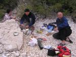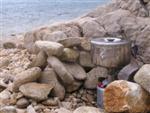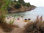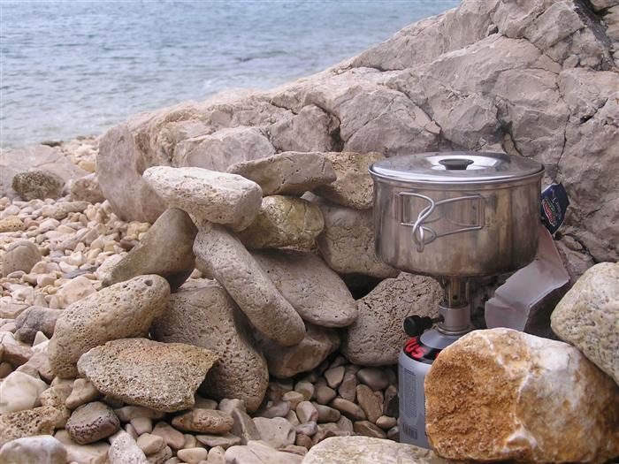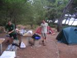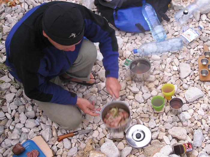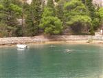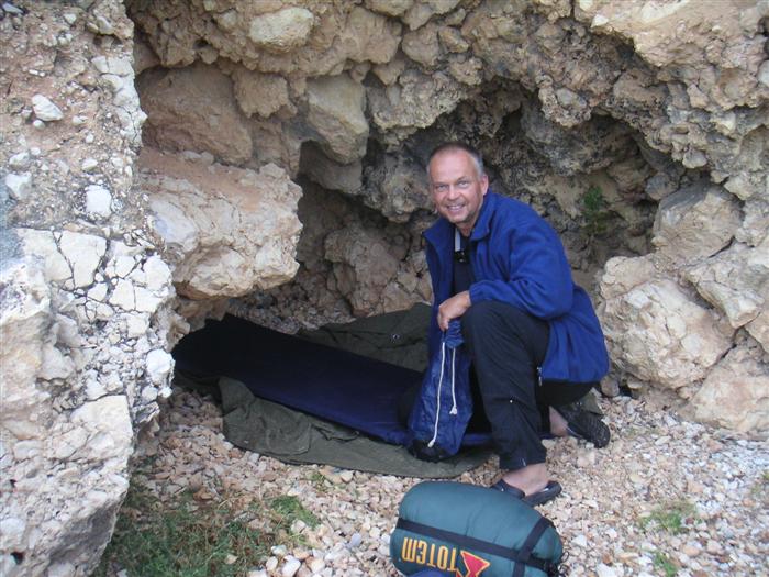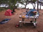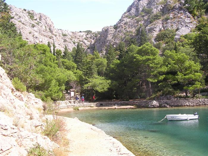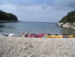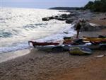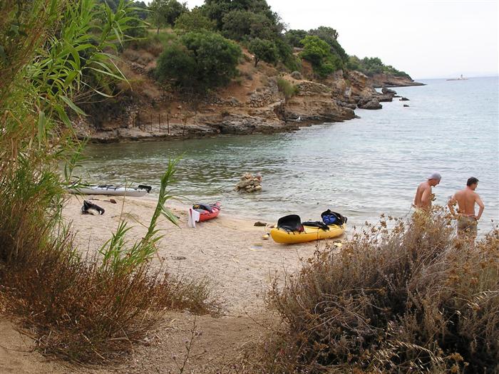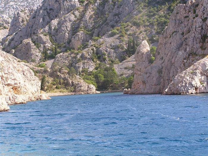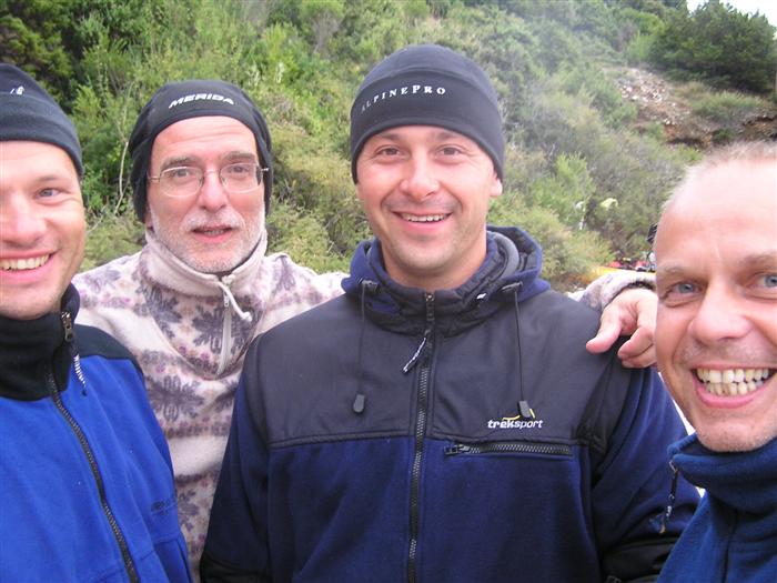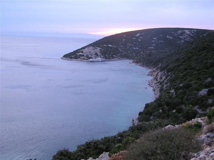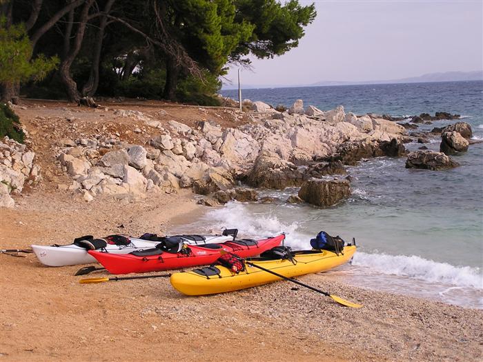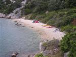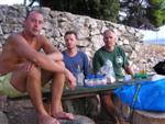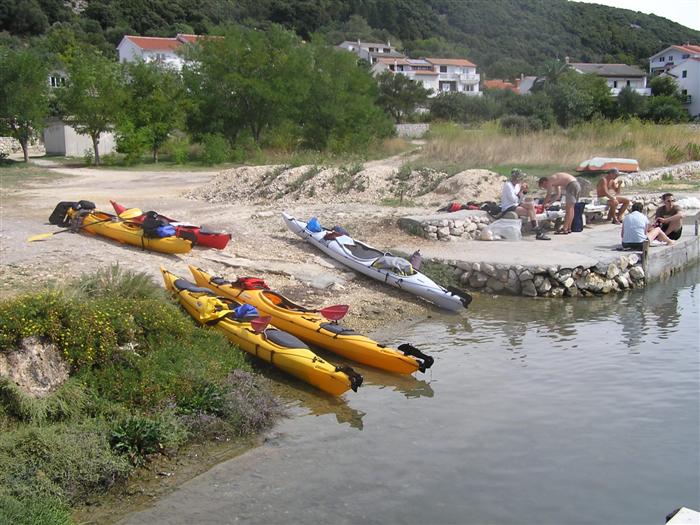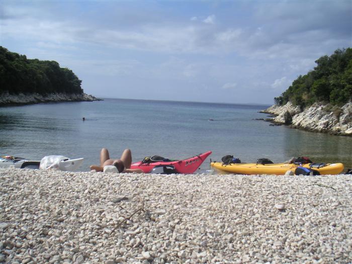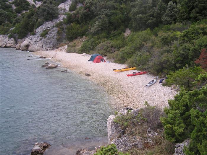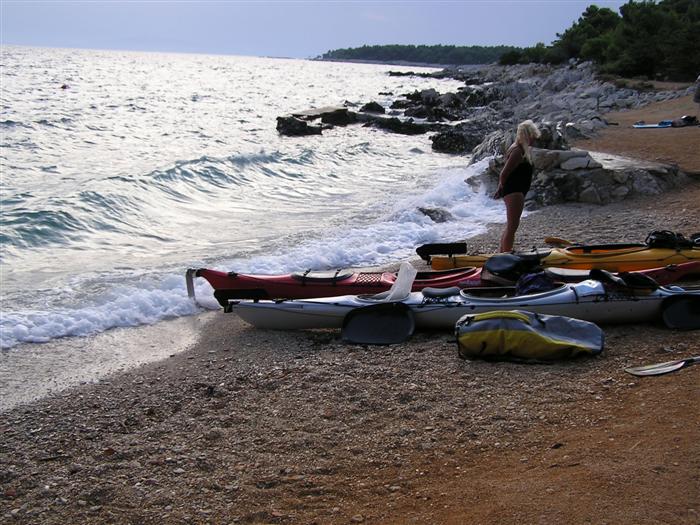 V noci trochu pršalo, ale do rána sa more utíšilo. Hneď zo stanu si idem zaplávať do mora – tak si predstavujem dovolenku pri mori! Pokračujeme ďalej okolo komplexu Suha Punta a ďalej už neosídleným pobrežím. Príjemné počasie, slabý vetrík, takto si asi predstavujem pohodový seakajaking! Pristávame na pustej, ale útulnej pláži: plávame, šnorchlujeme a idem sa peši pozrieť voňavým lesom kúsok do vnútrozemia. More nás ťahá ďalej a pokračujeme ďalej na SZ. Zastavujem pri osamelom rybárovi a pýtam sa na počasie: zas to isté – poobede príde bura a nechoďte za mys Kalifront. Mys Kalifront je tupý a asi 2 km široký – keď vychádzame spoza Dolna punta vystavujeme sa S vetru a začína to byť trochu husté. Akurát tak jedným okom stíham sledovať pobrežie a vlny lámuce sa na skalách, inak treba venovať pozornosť kajaku a vlnám. Škoda, že s nami nie je miestny znalec – tu by mali byť na brehu veľmi zaujímavé miesta. Na chviľu zastavujem pri Sigim a Martinovi, ktorý sa potrebuje vyčurať do fľaše a tak natáčajú kajak proti vlnám. Vietor ma trochu stočí nesprávnym smerom a dosť bojujem, kým sa mi podarí proti vetru kajak správne nasmerovať – chalani sú už medzitým tatam. To už sme pri severnom cípe Gorna punta, opúšťame polostrov Kalifront a Milan naberá kurz krížom cez záliv priamo na osadu Gonar – asi 3 km preplavba. Vidíme teraz dobre hrebene pohoria Velebit a hrozivé čapice mrakov zakrývajúce vrcholy. Ako vchádzame hlbšie do zálivu Kamporska draga, tak vietor už nie je taký silný, napriek tomu pristávanie na mini pláži v prístave je okorenené príbojom. Kajaky vynášame pre istotu na vyvýšené mólo a dobre robíme. V mrholení ideme do blízkej reštaurácie Gonar. Sedí, je a pije sa tu veľmi dobre, čašník a zrejme pán majiteľ má na všetko vhodnú pesničku a vie svoje jedlá náležite predstaviť. Na západe sa začína blýskať a na vzdialenom mori vidno biele čapice vĺn. Pán majiteľ ich odhaduje na 3 m a teší sa, že tu konečne po 4 mesiacoch prší! My už menej. Hoci tu sedíme už aspoň 2 hodiny, počasie sa veľmi nemení: vzdialená búrka neprichádza, ale stále leje. Nezostáva nám nič iné ako vstať, obliecť si suché bundy a pokračovať. Keď je človek už zašprickovaný v kajaku a trochu sa rozpádluje, zima ustupuje. Prechádzame úžinu medzi polostrovom a ostrovčekom Maman – je tu plytčina a niektoré vlny prichádzajúce od voľného mora sa tu zaujímavo lámu. Hľadáme vhodné miesto na camp na ďalších otrovčekoch, ale nič sa nám nepáči a tak vo vytrvalom daždi križujeme asi 2 km zátoku Supetarska draga na opačný breh so zakotvenou starou a opustenou osobnou loďou Jadrolinija. Neďaleko sú 2 stiesnené pláže, ale vystavené silnému vetru a tak hľadáme niečo lepšie a sledujeme breh až k marine Supetarska Draga. To už je ale príliš civilizované a tak sa vraciame späť 3 km na pláž s pustým domčekom a nasprayovaným nápisom Drunken Lalubies. Fučí tu statočne, ale dážď ustáva. Hneď po pristátí, s ešte vyhriatym telom sa kus okúpem v mori, ktoré je výrazne teplejšie než vzduch a obliekam si suché veci – zlatý kajak, čo ti všetko hravo odvezie! Milan sa uloží v malej skalnej jaskynke, my staviame stany na pláži. Vietor sa našťastie mierni a v závetrí sa dá aj variť a tak robím špagety. Dnes to bolo 20 km.